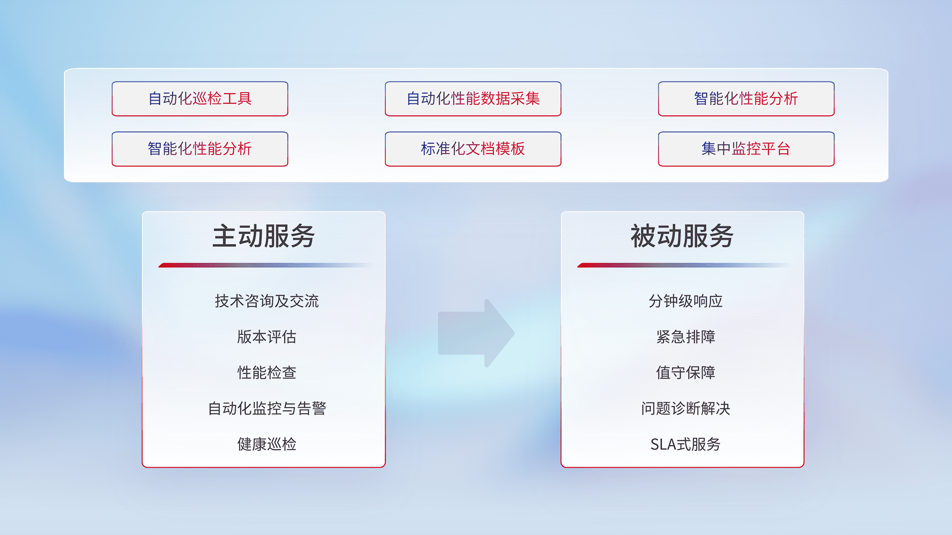 智能化工具和标准化文档,,,,保障服务质量,,提供主动服务(包含技术咨询、、版本评估、、、、性能检查、、、、自动化监控与告警、、、、健康巡检)和被动服务包含(分钟级响应、、紧急排障、、值守保障、、、、问题诊断解决、、、SLA服务)。。。。